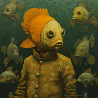 After the images came in, I realized I had an image in my mind for what I was hoping MidJourney would deliver. It generated a bunch of images of anthropomorphic goldfish, which are charming in thier own way.