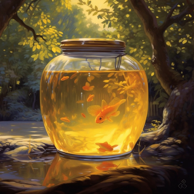 A clear honey jar sits below a shady tree. A shy bee peeks from behind the tree. Inside the honey jar is a goldfish.